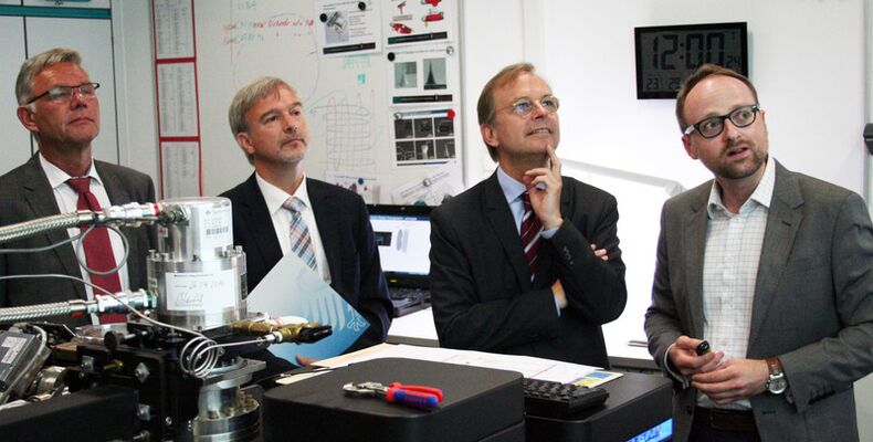 Quelle: MPIE Bildtext: Thomas Rachel, Parlamentarischer Staatssekretär im Bundesministerium für Bildung und Forschung (Dritter von links), Prof. Dr.-Ing. Dierk Raabe, Direktor am Max-Planck-Institut für Eisenforschung und Leiter des Projektes (Zweiter von links) und Dr.-Ing. Peter Dahlmann, Geschäftsführendes Vorstandsmitglied des Stahlinstituts VDEh (Erster von links), mit Dr. Eric Jägle, Leiter der Gruppe „Additive Fertigung“, im Labor der Atomsonde, einem Mikroskop, mit dem die atomare Struktur von Stählen und anderen Materialien untersucht werden kann. (Foto: Andreas Sturm, MPIE)