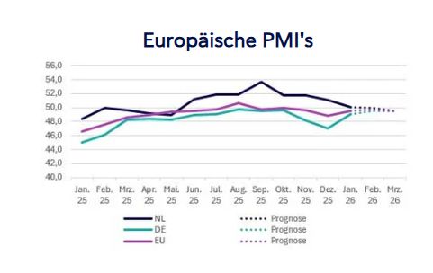 Trotz der Preissteigerungen deutet vieles darauf hin, dass die Industrie im ersten Quartal insgesamt leicht anziehen wird. Bei der Versorgung mit Halbzeugen lässt sich aktuell ein Ungleichgewicht zwischen einer vergleichsweise niedrigen Nachfrage und einem hohen Angebot beobachten, was dämpfend auf das Preisniveau wirkt. Der PMI liegt weiterhin über 50 Punkten und signalisiert damit insgesamt positivere Erwartungen als im vergleichbaren Vorjahreszeitraum.