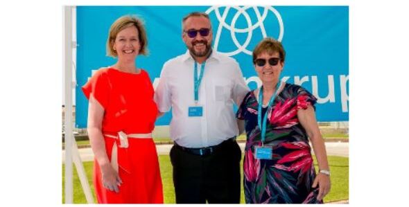 Bildtext: Feierliche Einweihung der neuen Photovoltaikanlage mit Ilse Henne, Chief Transformation Officer von thyssenkrupp Materials Services, Oliver Bensing, Geschäftsführer von thyssenkrupp Materials Processing Europe in El Puig, und Luisa Salvador, Bürgermeisterin von El Puig.