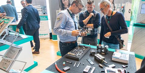 Im Ausstellungsbereich informierten 34 Aussteller über ihre Produkte und Dienstleistungen. Meusburger zeigte an seinem Ausstellungsstand Produktneuheiten wie die Werkzeuginnendrucksensoren oder die neue Schrägauswerfereinheit. Im Bereich Heißkanal präsentierte das Meusburger Unternehmen PSG innovative und kundenspezifische Lösungen. Diese Lösungen ermöglichen eine Verkürzung der Zykluszeiten, schnelle Farbwechsel oder auch die Anspritzung von schwer zugänglichen Teilen. Selbstverständlich war auch der profiTEMP+ Heißkanalregler Thema im Bereich Regeltechnik.