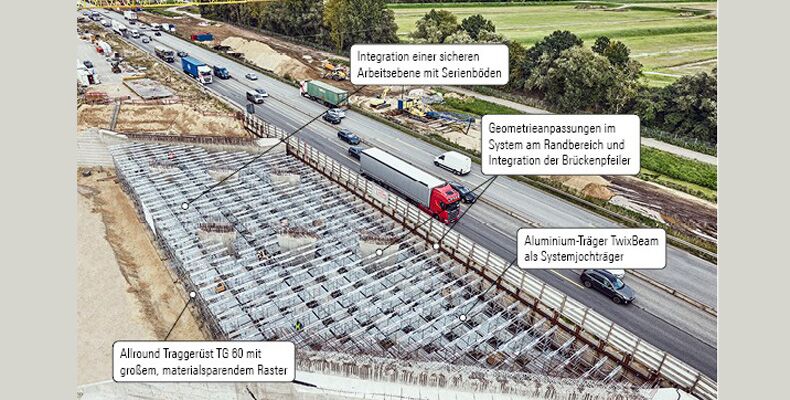 Großes und damit materialsparendes Raster, Längenausgleich am Randbereich und im Bereich der Brückenpfeiler ohne zeitaufwendige Sägearbeiten sowie Integration einer Arbeitsebene unterhalb der Schalung mit Serienbauteilen – die Kombi-Lösung aus Allround Traggerüst TG 60 und dem innovativen Aluminium-Träger TwixBeam als Systemjochträger überzeugte beim Bau einer Autobahnbrücke.