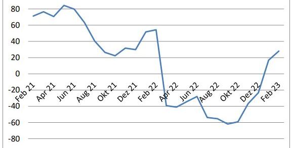 Auf Sicht von sechs Monaten erwartet mittlerweile ein großer Teil der Befragten eine Verbesserung der konjunkturellen Lage. Die gegenwärtige Situation wird allerdings nach wie vor als relativ schlecht eingeschätzt. Es sind – wie schon im Vormonat – die verbesserten Ertragseinschätzungen der energie- und exportorientierten Branchen sowie der konsumnahen Wirtschaftsbereiche, die für den Anstieg sorgen.