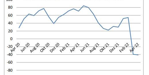 Die Einschätzung der konjunkturellen Lage für Deutschland verschlechtert sich in der aktuellen Umfrage erneut deutlich. Der Wert des Lageindikators sinkt um 9,4 Punkte und liegt damit bei minus 30,8 Punkten. Dies ist der zweite Rückgang in Folge seit Beginn des Kriegs in der Ukraine.