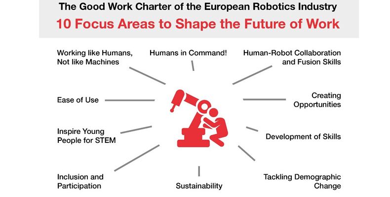 Die europäische Charta stellt ausdrücklich den Menschen in den Mittelpunkt: Im Fokusbereich 1 ist festgelegt, dass Roboter den Arbeitnehmern repetitive Arbeiten abnehmen sollen, die wegen der Monotonie nicht zumutbar sind - Mitarbeiter sollen wie Menschen und nicht wie Maschinen arbeiten. Fokusbereich 2 beschreibt, dass immer der Roboter dem Menschen dient und nicht umgekehrt. Damit steht die europäische Robotik-Industrie für einen „Human-in-Command-Ansatz". Die weiteren Fokusbereiche befassen sich mit der Entwicklung von Kompetenzen, der Mensch-Roboter-Kollaboration, einfacher Maschinenbedienung, Initiativen speziell für junge Menschen und Strategien, den demografischen Wandel zu bewältigen.