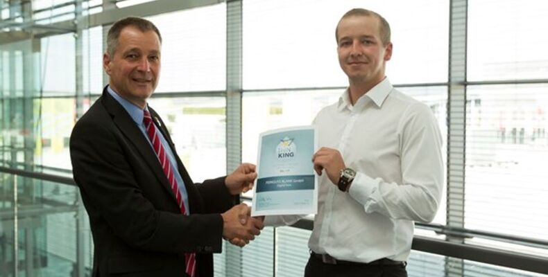 Quelle: BDG Bildtext: Herr Dr. Seeliger (li.), Geschäftsführer Leichtbau BW GmbH und Herr Wetzel (re.), Entwickler bei FEINGUSS BLANK bei der Urkundenübergabe (Foto: Leichtbau BW GmbH).