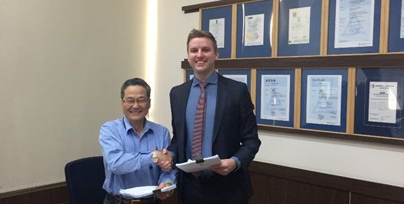 Quelle: FRIEDRICH KOCKS GMBH & CO KG Bildtext: Tain-Rong Chen (Senior General Manager) Walsin Lihwa mit Christoph Klebba (Area Sales Manager, Kocks) (Foto: Kocks)