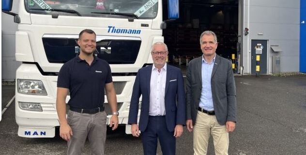 Bildtext (v.l.): Daniel Baiz (Betriebsleiter Stahl bei Thomann), Valentin Kaltenbach (CEO Kaltenbach.Solutions) und Rolf Thomann (Unternehmensinhaber) vor dem Betrieb in Hergatz am Bodensee .