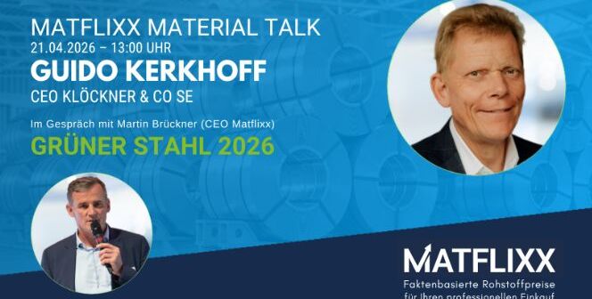 Wie wirtschaftlich tragfähig ist grüner Stahl – und was bedeutet das konkret für Einkauf und Supply Chain? Diese Fragen stehen im Mittelpunkt des „Matflixx Material Talk“ am 21. April 2026. In einem Live-Gespräch gibt Guido Kerkhoff, CEO von Klöckner & Co SE, Einblicke in aktuelle Entwicklungen rund um CO₂-reduzierte Stahlprodukte.