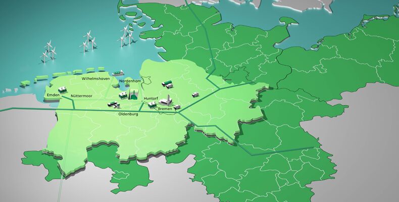 Mit dem Vorhaben „Clean Hydrogen Coastline“ beabsichtigt EWE in einer ersten Phase 370 Megawatt Erzeugungskapazität mit entsprechender Speicherung von grünem Wasserstoff in unterirdischen Salzkavernen zielgerichtet ins Energiesystem zu integrieren. Der zum Beispiel durch Offshore-Strom erzeugte Wasserstoff soll unter anderem für die klimaneutrale Stahlerzeugung, die Chemieindustrie und auch Kraftwerke eingesetzt werden. Außerdem kann mit „Clean Hydrogen Coastline“ die Grundlage geschaffen werden, um wasserstoffbetriebene Busse, Züge und Nutzfahrzeuge in Betrieb zu bringen. Die Optimierung der Gasnetze für den Transport von Wasserstoff im Nordwesten würde eine Verbindung für das grüne Gas zwischen den Niederlanden, Deutschland und Dänemark ermöglichen.