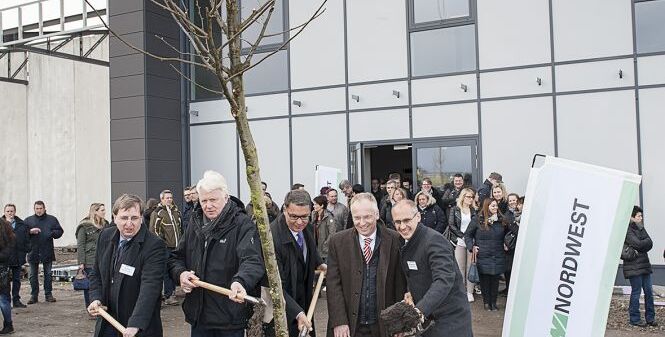 verzögert. Nachdem der letzte Stahlträger für den Showroom in der neuen Zentrale montiert wurde, feierte der Einkaufsverbund jetzt Richtfest. Am 26. April griffen Dortmunds Oberbürgermeister Ullrich Sierau und die Nordwest-Vorstände Bernhard Dressler und Jörg Simon zum Spaten, um – statt einen Richtkranz auf den Rohbau zu setzen – den Baum des Jahres 2016 zu pflanzen.