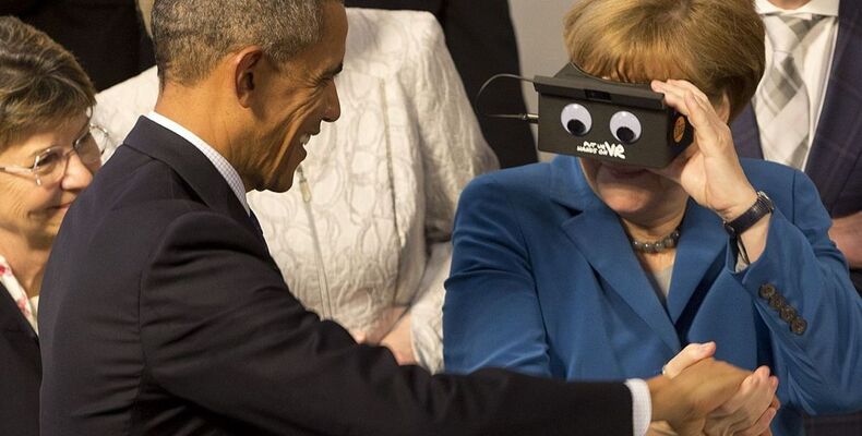 Quelle: Deutsche Messe AG Bildtext: Beim Eröffnungsrundgang testeten Angela Merkel und Barack Obama eine Virtual-Reality-Brille (Foto: obs/Deutsche Messe AG Hannover/ifm electronic GmbH)