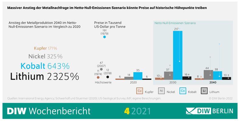 Zu diesem Ergebnis kommt eine Szenarioanalyse am Deutschen Institut für Wirtschaftsforschung (DIW Berlin). Ökonom Lukas Boer aus der Abteilung Weltwirtschaft berechnet anhand historischer Daten in einem Szenario der Internationalen Energieagentur (IEA), wie sich die Preise dieser Metalle entwickeln könnten. Das Szenario basiert auf einem hohen Einsatz erneuerbarer Energien und Emissionsneutralität bis zum Jahr 2050. „Wenn wir davon ausgehen, dass die Nachfrage weiter stark zunimmt, dürften die Preise für Kupfer, Lithium, Nickel und Kobalt um das Jahr 2030 herum auf einen Höchststand steigen und dort auch über Jahre verharren“, erläutert Boer. „Damit würden sie ein Hindernis für die Energiewende darstellen.“