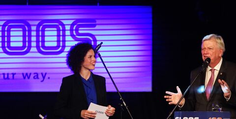 Vorschaubild: Die Urenkelin des Firmengründers und Moderatorin des Festaktes Lara Pelzer (links) mit dem Hessischen Ministerpräsidenten Volker Bouffier (rechts)