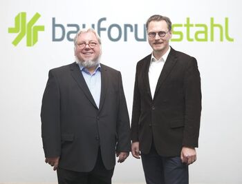 Quelle: bauforumstahl; Bildtext: Die Geschäftsführer des bauforumstahl, Volker Hüller (links) und Bernhard Hauke (rechts); (Foto: bauforumstahl)