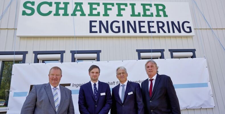Quelle: Schaeffler Bildtext: Christian Degenhardt, Gründer und ehemaliger Geschäftsführer der IFT Ingenieur-gesellschaft für Triebwerkstechnik mbH, Christopher Lehne, Rolf Laufs, beide Schaeffler Engineering, und Prof. Dr.-Ing. Peter Gutzmer, Stellvertretender Vorsitzender des Vorstands und Vorstand Technologie der Schaeffler AG, (v.l.n.r.) (Foto: Schaeffler Engineering)