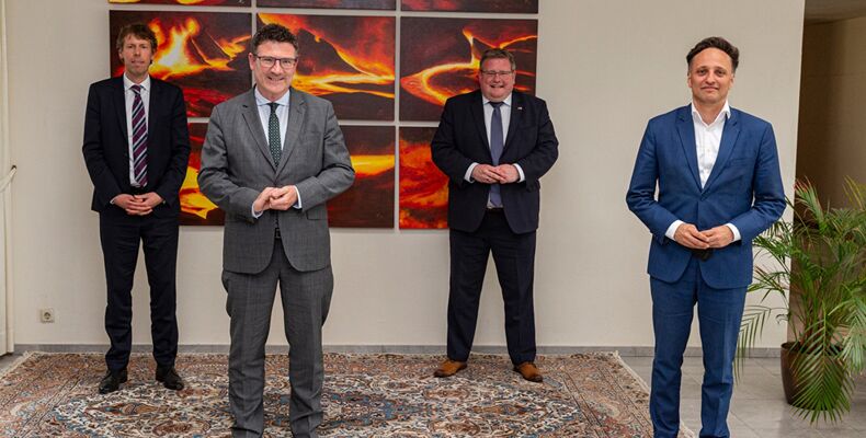 Der Innovationsbeauftragte „Grüner Wasserstoff“ des Bundesministeriums für Bildung und Forschung (BMBF), Dr. Stefan Kaufmann (im Bild 2. v. l.), besuchte gemeinsam mit Ammar Alkassar, Bevollmächtigter des Saarlandes für Innovation und Strategie (Staatskanzlei des Saarlandes), und Markus Uhl, Mitglied des Bundestages, den Standort Dillingen, um sich über die nächsten wichtigen Schritte der saarländischen Stahlpartner auf dem Weg zu einer CO2-neutralen Stahlproduktion zu informieren.