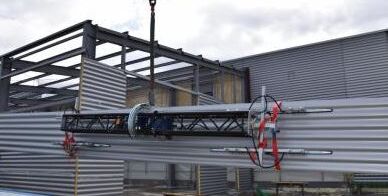 Ein weiteres Produkt aus der AERO-LIFT Cladding-Familie ist der CLAD-TURN®. Mit ihm können Sandwichpaneele und Trapezbleche bis zu einer Länge von 18 Meter auf dem Dach oder an der Wand verlegt werden. Der Clou dabei: Die Bleche und Paneele können ohne manuellen Aufwand direkt vom Stapel aufgenommen werden und in die gewünschte Position gebracht werden. Denn mit einem CLAD-TURN® lassen sich Elemente bis zu einem Gewicht von 400 kg elektrisch um bis zu 180˚ drehen. Auch ein Drehen in Positiv – oder Negativlage ist präzise möglich.