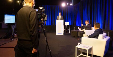 Unter dem Motto "Let's talk about the future" diskutierten Branchenexperten, Entscheider und Vordenker aus vier EU-Staaten und aus China live im Tata Steel Studio im niederländischen IJmuiden beziehungsweise zugeschaltet per Video. Neben Gastgeber Karl Haider, Chief Commercial Officer von Tata Steel Europe (Bild re), und Moderator