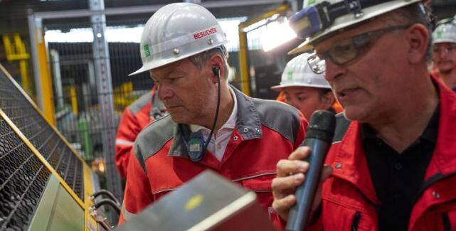 Bundeswirtschaftsminister Dr. Robert Habeck, der die Georgsmarienhütte am Donnerstagmorgen besuchte, ließ sich im Zuge einer Werksbesichtigung die Details der Wärmebehandlung an der bereits installierten ersten Einzelstabvergütungsanlage erklären und überreichte für die jüngste Förderung symbolisch einen Scheck an die Unternehmensführung der GMH Gruppe: „Wir wollen, dass statt Kohle Strom eingesetzt wird zur Produktion, und dieser Strom möglichst erneuerbar erzeugt wird. Die Georgsmarienhütte ist schon vor 30 Jahren, als Familienunternehmen, damals ohne öffentliche Förderung vorangegangen und hat angefangen, die Technik einzubauen, die heute Standard werden soll. Ich bedanke mich dafür, dass die GMH Gruppe so unverdrossen an der Zukunft arbeitet, an der Automatisierung, an neuen energieeffizienten Prozessen, und trotz aller Widrigkeiten vorangeht.“