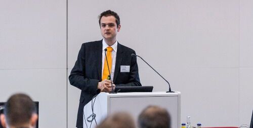 Quelle: KASTO Bildtext: Sönke Krebber bei seinem Vortrag über Vorentwicklung der Sägetechnik bei KASTO (Bildquelle: Fraunhofer IPA, Foto: Rainer Bez)
