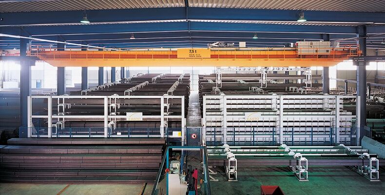 Im UNIBLOC-System lagern Rohre, Stäbe, Stahlträger und anderes Langgut auf robusten, präzise geschweißten Jochpaaren. Diese lassen sich übereinander stapeln, wodurch der vorhandene Platz wesentlich besser genutzt wird. Das Materialhandling übernimmt eine Lasttraverse mit patentierten Greiferarmen, die je nach Ausführung bis zu drei Lagen der Stapeljoche gleichzeitig transportiert und umstapelt. Die Traverse lässt sich entweder manuell per Stapler bewegen, automatisch über ein Portalbediengerät oder einen Hallenkran, oder mit Magnet-Hebetechnik.
