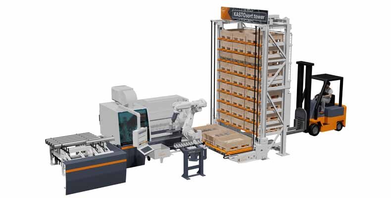 Ein ganz aktuelles Thema am Stand ist die platzsparende und vollautomatisierte Komplettlösung KASTOsort tower. Diese übernimmt die Anarbeitung inklusive Absortierung und funktioniert im 24/7-Betrieb. Die Entwickler kombinierten zuverlässige Technologien zu einem hochproduktiven Konzept, das aus einem Kettenmagazin an der Zufuhrseite, einer Kreissäge KASTOvariospeed, einem Roboter KASTOsort und einem Lagersystem KASTOecostore besteht. Das System ist unter anderem für Metallverarbeiter interessant, die bereits eine Hochleistungssäge vom Typ KASTOvariospeed oder KASTOtec mit oder ohne KASTOsort-Roboter einsetzen. Es ist aber auch möglich, andere KASTO-Sägen anzubinden. Die Unternehmen bekommen damit eine einfache und kostengünstige Lösung, um überschaubare Materialmengen zu puffern.