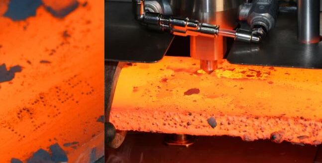 Die neue Prägeanlage setzt auf einen sechsstelligen Zifferncode in Punktschrift, der direkt auf den heißen Blechen platziert wird. Mit einer Schrifthöhe von 15 mm und einer Prägetiefe von mindestens 0,5 mm wird optimale Lesbarkeit, selbst für Schrifterkennungssysteme gewährleistet. Die Markierung bleibt klar erkennbar, auch bei auftretender Verzunderung. Die automatische Prägung erfolgt durch drei Prägeköpfe, die den Code von unserer intelligenten Steuerung erhalten. Der obere Prägekopf tastet die Oberfläche ab und passt sich an die Blechdicke an, während der seitliche Prägekopf Unebenheiten bis zu 12 mm ausgleicht.
