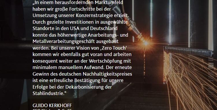 Für sein Engagement im Bereich Nachhaltigkeit wurde Klöckner & Co erneut ausgezeichnet und erhielt bereits zum zweiten Mal den Deutschen Nachhaltigkeitspreis, die renommierteste Auszeichnung Europas für ökologisches und soziales Engagement. Die Jury würdigte Klöckner & Co in der Kategorie „Chemie- und Materialiengroßhandel“ und lobte das Unternehmen als „Leuchtturm“ im Stahl- und Metallsektor. Diese Ehrung bestätigt die Rolle von Klöckner & Co als Vorreiter in der nachhaltigen Transformation der Branche und unterstreicht die erfolgreiche Integration von Nachhaltigkeit in das Geschäftsmodell.