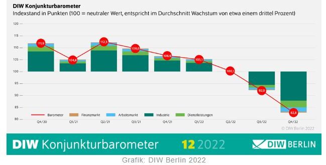 Die Wirtschaftsleistung dürfte im Winterhalbjahr etwas zurückgehen, eine schwere Rezession wird jedoch zunehmend unwahrscheinlicher und die konjunkturellen Aussichten sind vorsichtig positiv. So gingen die Preise für Energie zuletzt wieder etwas zurück. Trotz der kalten Temperaturen in den vergangenen Wochen sind die Gasspeicher weiterhin gut gefüllt und die Gasversorgung ist stabil. „Wir dürfen deutlich weniger pessimistisch in das neue Jahr blicken als noch im Spätsommer erwartet“, sagt DIW-Konjunkturexperte Guido Baldi. „Für allzu großen Optimismus ist es dennoch zu früh. Dafür sind insbesondere die globalen Risiken weiterhin hoch – nicht nur hinsichtlich der weiteren Entwicklung des Krieges in der Ukraine.“