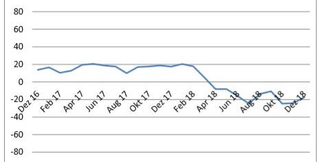 Die ZEW-Konjunkturerwartungen für Deutschland steigen im Dezember 2018 um 6,6 Punkte auf einen neuen Wert von minus 17,5 Punkten an. Die Konjunkturerwartungen sind trotz dieser Verbesserung weiterhin negativ und erheblich unterhalb des langfristigen Durchschnitts von 22,5 Punkten. Die Bewertung der aktuellen konjunkturellen Lage für Deutschland hat sich im Dezember weiter deutlich verschlechtert. Sie fällt um 12,9 Punkte auf einen Wert von 45,3 Punkten.