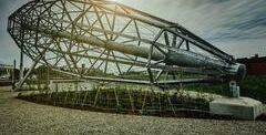 Installation verweist auf die Halbwertszeit technischer Utopien, die trotz ihrer Gewaltigkeit wieder zerfallen und von der Natur zurückerobert werden.