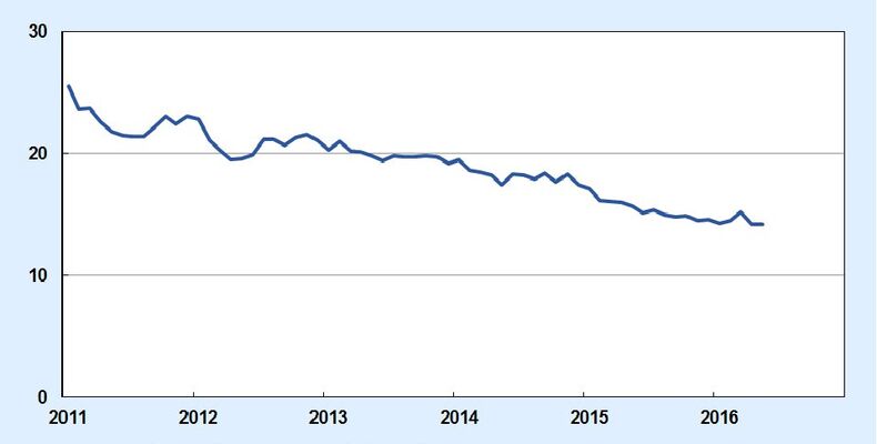 Die Kredithürde für die gewerbliche Wirtschaft, also der Anteil der Firmen, die Probleme bei der Kreditvergabe melden, ist im Mai unverändert bei 14,2 Prozent geblieben. Laut dem ifo Institut wurde in der Industrie der Rekord vom Vormonat nochmals um 0,3 Prozentpunkte unterboten. Die Kredithürde liegt dort nun bei 12,2 Prozent. Dies war insbesondere auf die Großunternehmen zurückzuführen. Bei den kleinen Firmen stieg die Kredithürde hingegen erneut an. Auch im Bauhauptgewerbe gaben beim aktuellen ifo Konjunkturtest erneut so wenig Firmen wie nie an, Probleme beim Zugang zu Krediten zu haben. Nur im Handel stieg hingegen die Kredithürde wieder.