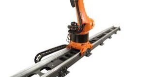 Bildbext: Vergrößerung des Arbeitsraums: Mit KUKA Lineareinheiten wird eine weitere Achse zum Roboter hinzugefügt.