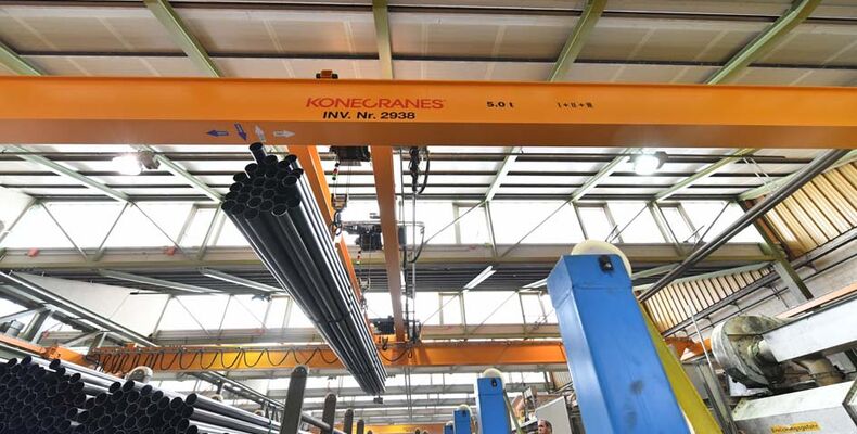 Vor, zurück, seitwärts, schräg: Stahlrohre müssen während ihrer Herstellung in alle Richtungen transportiert werden. Beim schweizerischen Stahlrohr-Hersteller Jansen kommen sie bündelweise vom Lager ins Tauchbad und wieder heraus. Damit sie sich dabei nicht verbiegen oder gar herunterfallen, braucht es eine besonders präzise, sichere und feinfühlige Lösung. Konecranes entwickelt deshalb für Jansen passgenaue CXT NEO Zweiträger-Brückenkrane mit einzigartiger Steuerung.