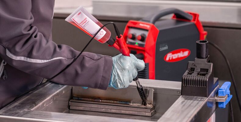Mit dem MagicCleaner wird das Elektrolyt präzise dosiert und gelangt gezielt dorthin, wo es benötigt wird. Die mitgelieferten Pads und Bürsten dringen sogar in Ecken und Zwischenräume vor, was für optimale Reinigung bei minimalem Materialeinsatz sorgt. Elektro-chemisches Reinigen ist zudem deutlich ressourcenschonender als herkömmliches Beizen in Chemikalienbädern und greift das Material nicht an, wie es beispielsweise beim Sandstrahlreinigen der Fall ist. Selbstverständlich setzt Fronius auch bei der Schweißnahtreinigung auf die innovative Inverter-Technologie, diese macht die Geräte leicht und besonders energieeffizient.