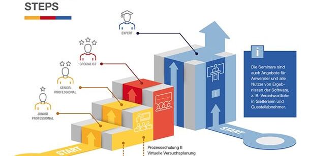 In den Schulungen und Workshops qualifizieren sich Softwareanwender für unterschiedliche Werkstoffe und Verfahren systematisch zu Experten im „autonomen Engineering“ sowie der methodischen Nutzung von virtueller Versuchsplanung und autonomer Optimierung mit MAGMASOFT. Dabei zieht sich eine strukturierte Vorgehensweise durch alle Qualifikationsebenen: von der Grundschulung bis zur spezifischen Anwendung der Software im unternehmenseigenen Gießprozess.