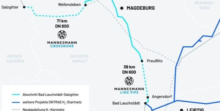 Die ONTRAS Gastransport GmbH aus Leipzig vergibt Großaufträge an zwei Rohrgesellschaften aus dem Salzgitter-Konzern. Die Mannesmann Grossrohr GmbH (MGR) wird Rohre für 70,6 km (ca. 18 Tt) und die Mannesmann Line Pipe GmbH (MLP) für 38,2 km (ca. 6 Tt) liefern. Hierbei handelt es sich um Rohre für das Neubauprojekt FGL 702, eine H2-Leitung von Wefensleben nach Salzgitter und von Angersdorf nach Preußlitz. Dieses Vorhaben ist ein weiterer Baustein des Wasserstoffkernnetzes und der Energiewende und legt eine der Grundlagen für die Produktion von „grünem Stahl“ in Salzgitter.