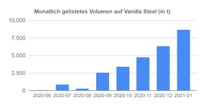 Während es schwieriger geworden ist Stahl innerhalb Europas zu beschaffen, konnte Vanilla Steel das auf der digitalen Plattform gelistete Volumen seit Oktober von 3.400 t auf 8.700 t im Januar (+154%) mehr als verdoppeln.