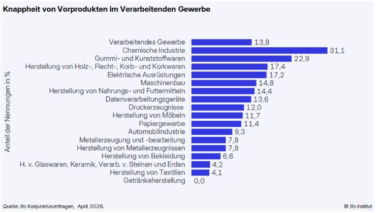 Die Zunahme der Engpässe zeigt sich vor allem in Branchen, die stark von ölbasierten und energieintensiven Vorprodukten abhängig sind. In der chemischen Industrie berichteten 31,1% der Unternehmen von Materialmangel. Auch bei den Herstellern von Gummi- und Kunststoffwaren ist der Anteil auf 22,9% deutlich gestiegen. Weitere wichtige Industriezweige sind ebenfalls betroffen: Im Maschinenbau stieg der Anteil auf 14,8% und bei den Herstellern elektrischer Ausrüstungen auf 17,2%. Auch die Automobilindustrie meldet wieder häufiger Probleme bei der Beschaffung von Vorprodukten.
