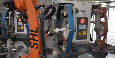 SHL hat in Brakel sechs Bearbeitungszellen mit je zwei Robotern zum Schleifen aufgebaut. Darüber hinaus stehen sechs Zellen mit insgesamt neun Robotern zur Feinbearbeitung mittels Scotchen sowie eine Roboterzelle zum Polieren für eine spezielle Variante zur Verfügung. Im Standard-Verfahren werden die Beschläge nach dem Schweißen aus der Vorfertigung auf SHL-Paletten aufgesteckt und an die Zelle gefahren. Der erste Roboter holt die Klinke ab und schwenkt sie zur Vermessungsstation. Anschließend erfolgt die Bearbeitung an der Doppelfreiband- und Kontaktrollen-Schleifmaschine DKS von SHL. Danach fährt der Roboter zur Umgreifstation und legt das Werkstück auf einen Vierkantstift.