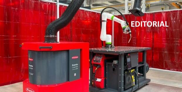 Fronius präsentiert auf der Tagung ROBOTER 2025 (18. und 19. Februar 2025, Fellbach) das System CWC-mobile, das sich durch die einfahrbaren Transportrollen leicht zwischen Großbauteilen bewegen lässt. Am Schweißtisch können die Mitarbeitenden kleine Serien unkompliziert schweißen. Geliefert wird die kompakte Anlage mit einem CE-konformen Sicherheitspaket. Dazu gehören Kraft- und Drehmomentbegrenzung des Cobots, eine Rauchabsaugung und Vorhänge für mobilen Blendschutz. Auch die persönliche Schutzausrüstung ist enthalten. Sie besteht aus durchstichsicheren Handschuhen, Arbeitsschutzkleidung und einem Schweißhelm.