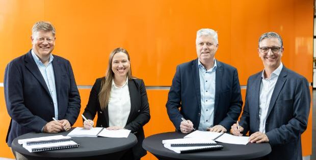 Bildtext: Bei der Vertragsunterzeichnung (von links): Hans Boels, CEO Lybover, Sandrina Sieverdingbeck, Geschäftsführung DEUMU, Uwe Rehren, Geschäftsführung DEUMU und Ioannis Giouvanitskas, Senior Executive Advisor, Lindemann Germany GmbH.