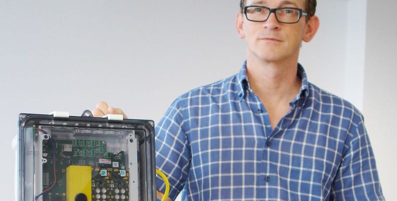 Quelle: Business Upper Austria Bildtext: VoXel-Gründer Dr. Simon Vogl mit seiner Time-of-Flight Kamera. (Foto: VoXel)