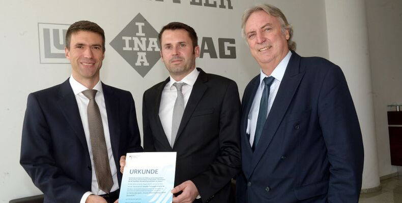 Quelle: Schaeffler AG Bildtext: Stefan Müller, Parlamentarischer Staatssekretär bei der Bundesministerin für Bildung und Forschung (links), übergab den Zuwendungsbescheid zum Förderprojekt "Smarte Dienstleistungs-Fabrik" an Prof. Dr.-Ing. Peter Gutzmer, stellvertretender Vorsitzender des Vorstands und Vorstand Technologie Schaeffler AG (rechts), und Schaeffler-Ingenieur Dr. Dennis Arnhold (Mitte) (Foto: Schaeffler AG)
