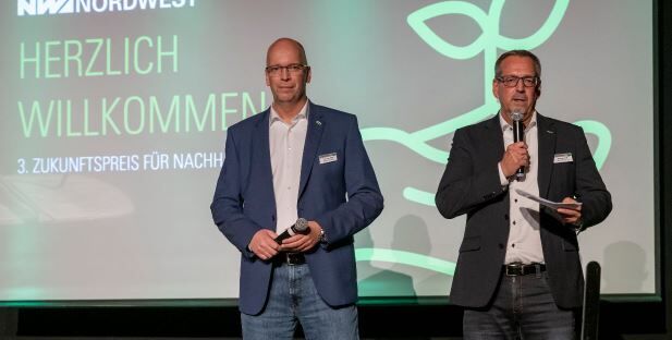 Bildtext 1: Die beiden NORDWEST-Vorstände Thorsten Sega (l.) und Michael Rolf (r.) bei Verleihung des 3. Zukunftspreises für Nachhaltigkeit von NORDWEST.
