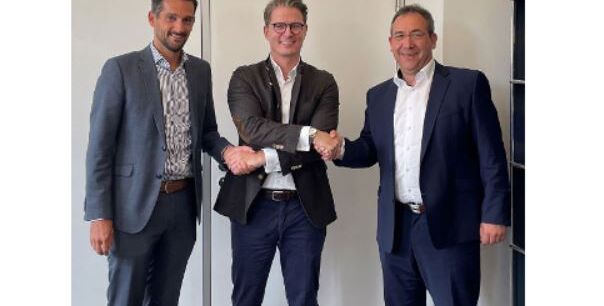 Bildtext: Geschäftsführer der SCHÄFER WERKE Gruppe Michael Mockenhaupt (re) und Marcus Düber (li) sowie Dr. Daniel Ebert (Mitte), Geschäftsführer Fidelium, nach erfolgreichem Vertragsabschluss.