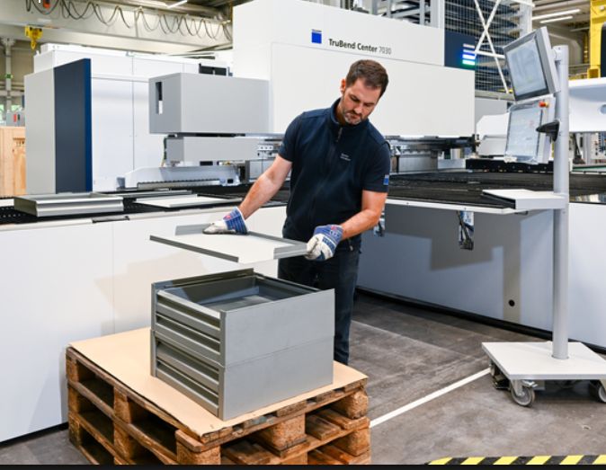 Höchstproduktiv arbeitet auch die Stanz-Laser-Maschine TruMatic 5000, die ebenfalls Teil des verketteten Systems ist. Unternehmen können damit Teile schneiden, stanzen und umformen. Mit ihrem sechs kW starken, hocheffizienten, TRUMPF Faserlaser eignet sie sich für ein breites Teilespektrum. Weiterhin verfügt sie über einen ToolMaster für automatisierte Werkzeugwechsel und einen Sheet Master, der den Materialfluss zwischen Maschine und Lager sicherstellt.