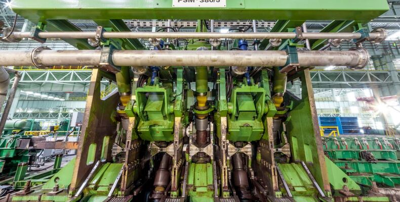 Quelle: SMS group Bildtext: PSM ermöglicht über die Walzspaltanstellung unter Last eine Einheitskalibrierung in der Vor- und Zwischenstraße und die stufenlose Produktion aller Fertigabmessungen. (Foto: SMS group)