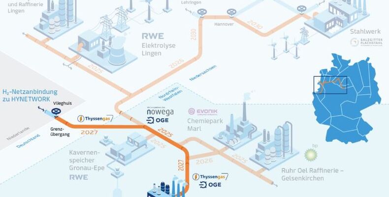 „Mit dem Vertrag nimmt die Wasserstoffwirtschaft in NRW und Deutschland weiter konkrete Formen an“, unterstreichen die Unternehmen. „Wir schaffen so die Möglichkeit, trotz noch ausstehender politischer Entscheidungen die Bausteine weiter vorzubereiten.“ Die Leitungen sollen Teil des Wasserstoff-Kernnetzes sein, dessen Finanzierung voraussichtlich erst im März in der Novelle des Energiewirtschaftsgesetzes offiziell beschlossen wird.