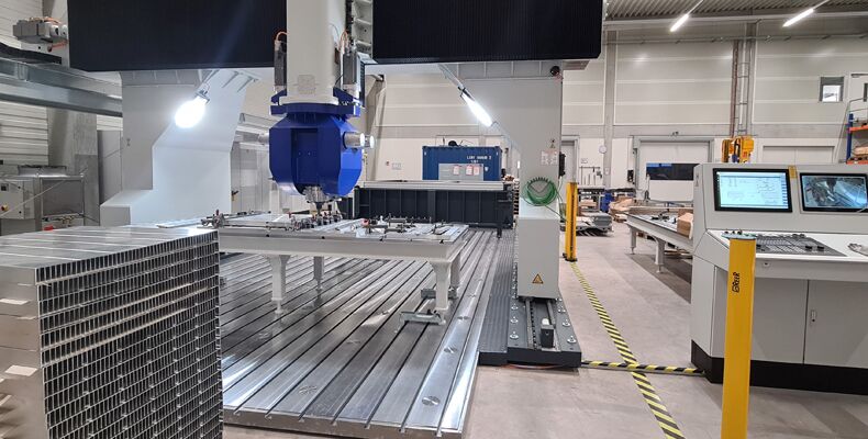 Bei alleiniger Verwendung der oberen 5-achsigen Spindel sind komplexe dreidimensionale Bauformen mit bis zu 30mm Einschweißtiefe möglich. Oder auch Platten in Größen von bis zu 8 m x 3,5 m. So werden beispielsweise Batterieböden für E-Fahrzeuge, Kühler oder sonstige Gussbauteile auf der Anlage rührreibgeschweißt. Aber auch für kleine Bauteile und geringe Einschweißtiefen ist die große Portalmaschine geeignet. Legierungsabhängig sind Einschweißtiefen ab 0,5 mm möglich - das sind ungefähr 80 Lagen einer haushaltsüblichen Alufolie.